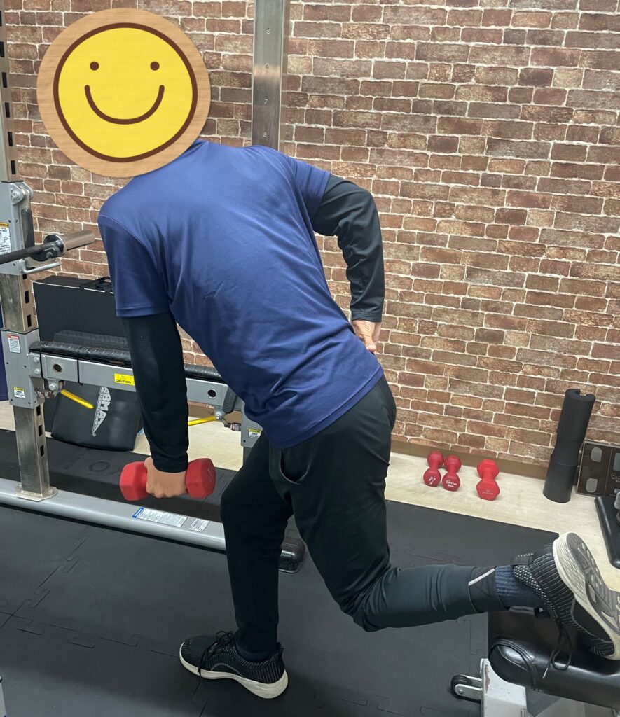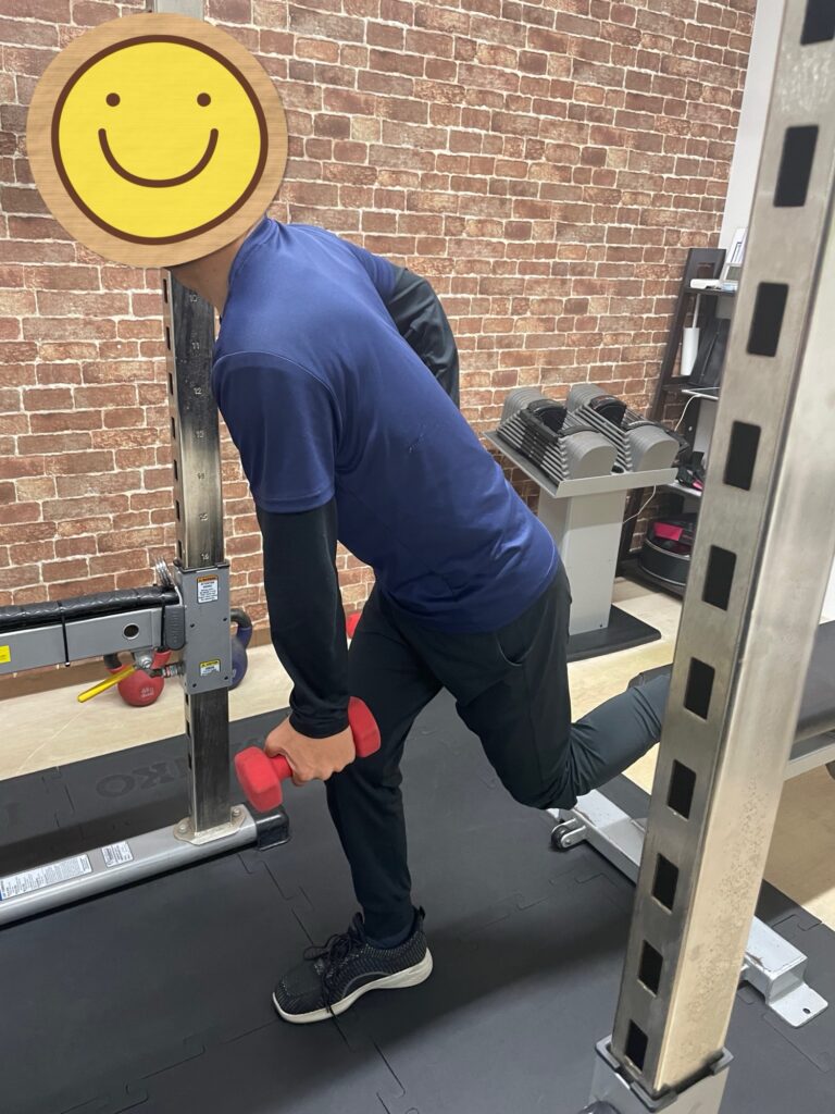 運搬のお仕事をされていて背中や腰に痛みがあったお客様ですが、最初はストレッチをメインで崩れていた体軸を整えることからスタートをしたのですが、現在はご覧の通りウエイトを持って片足でスクワットができるまで体力がついてきました。