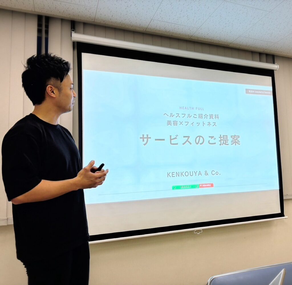 他ジムオーナー様やトレーナーの方々に向けて、KENKOUYAで実際に行っている「フィットネス×美容」の新しい提案として、実際に商品の成分・効果・導入事例などをプレゼンしている様子です。