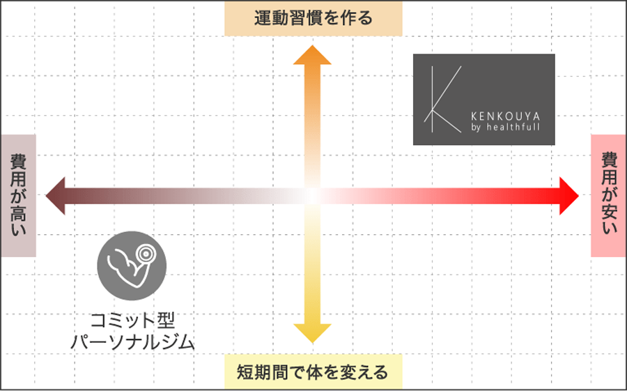 KENKOUYAは、お客様の健康をサポートするパーソナルジムです。「運動習慣」が身に付くよう一人ひとりに合わせてメニューを提案し、長期的にジムに通い続けられる料金コースをご用意しております。トレーニングを継続することで健康的な体は美しさを引き立て、健康年齢を引き下げ美容を向上させることができます。
